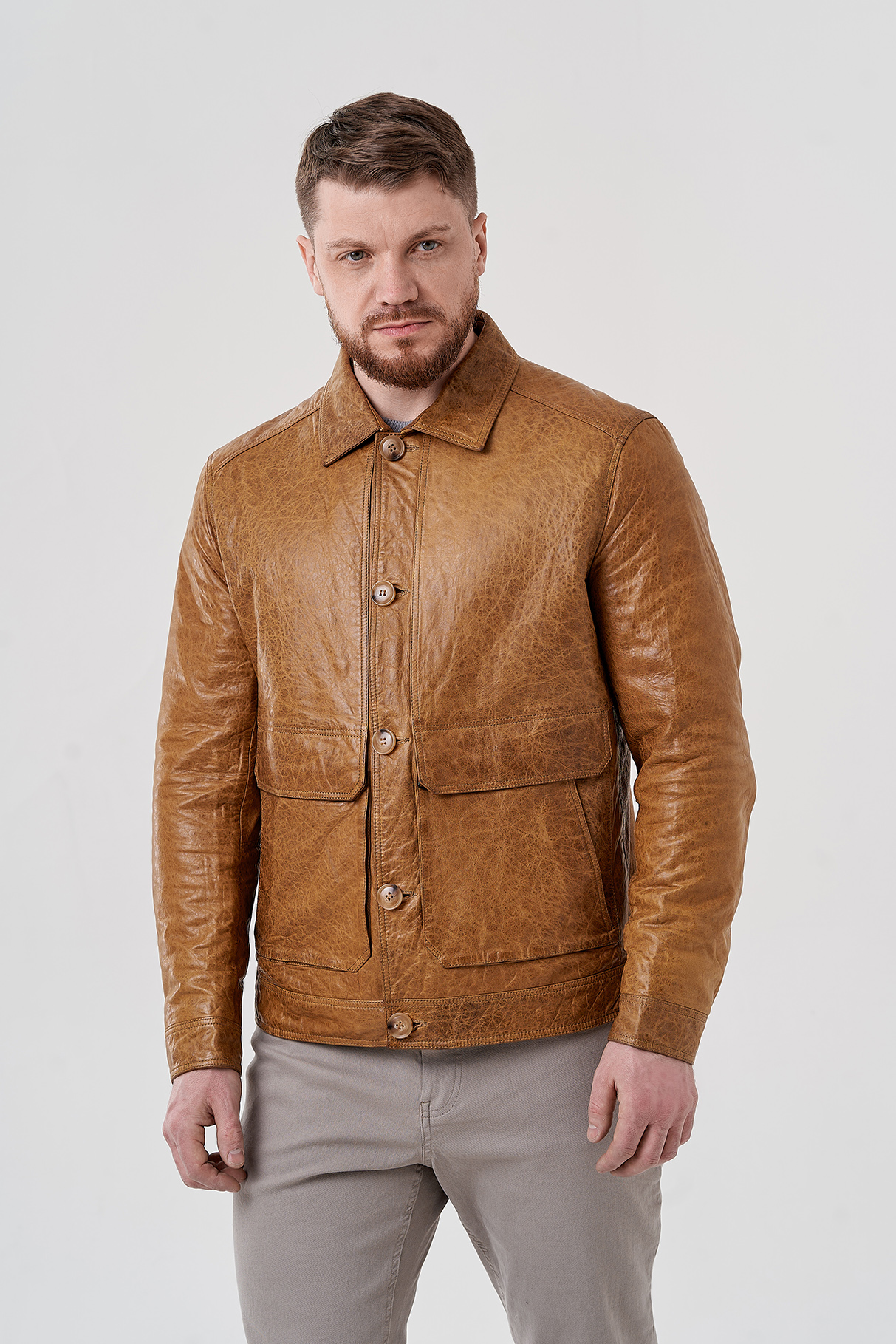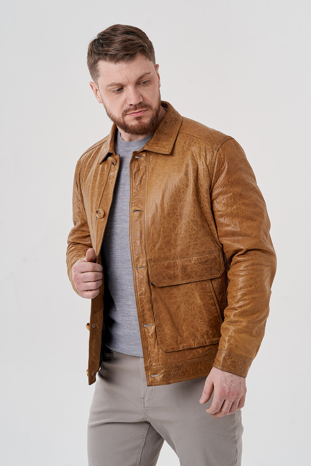 Мужская куртка бежевого цвета. Выполнена из натуральной кожи с оригинальным тиснением. Подклад из полиэстера. Застегивается на пуговицы. Для удобства расположены карманы с клапанами. Отложной воротник и застежки на кнопки на рукавах. Длина 70 см кофмортная и не будет стеснять движений.