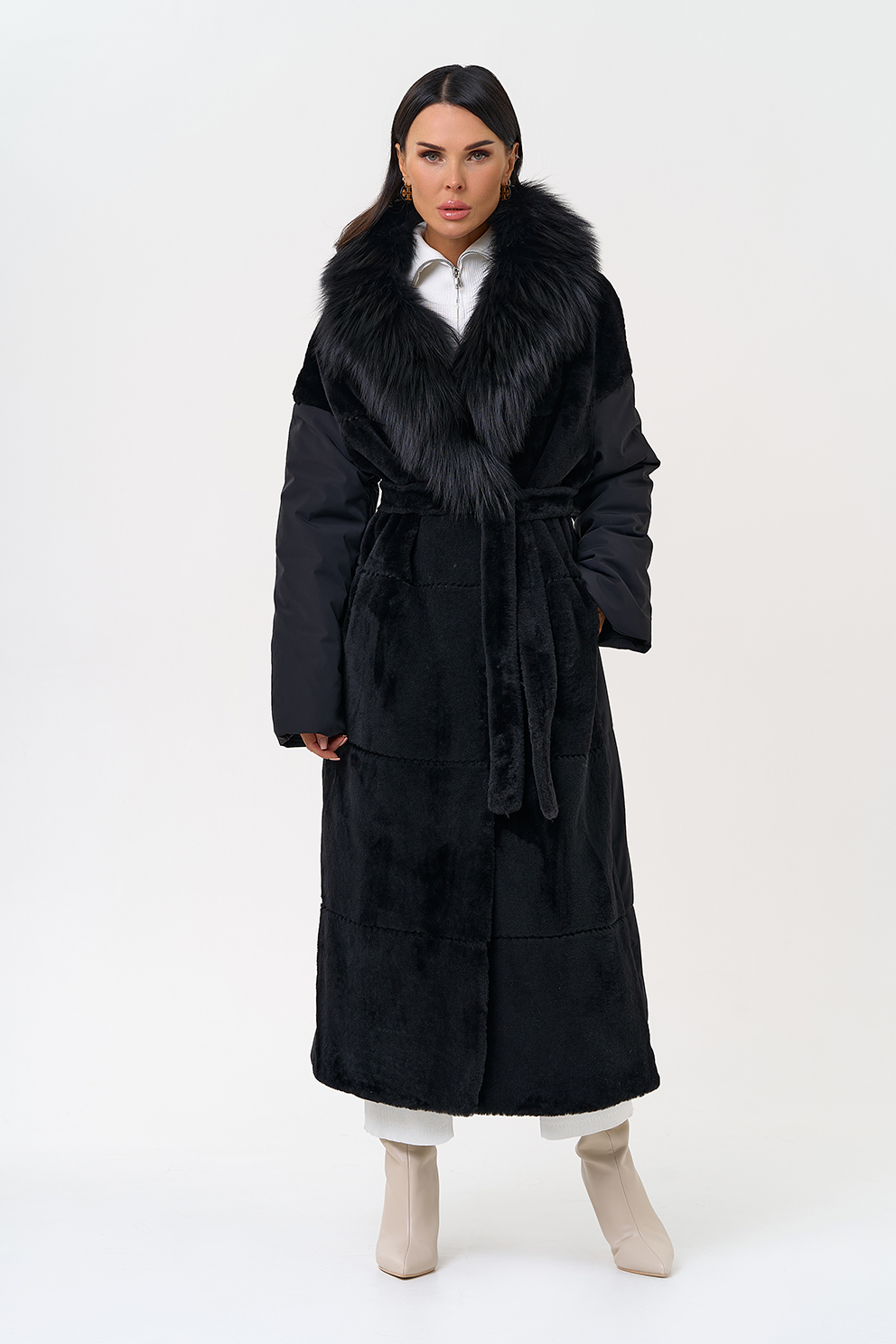 Вид застежки - кнопки, пояс из меха овчины